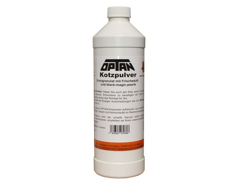 Nur etwas OPTAN Kotzpulver aufstreuen, kurz warten bis sich ein fester Klumpen bildet. Danach mit Kehrschaufel im Restmüll entsorgen. Durch das Aufstreuen wird der scharfe Geruch/Keime sofort gebunden.