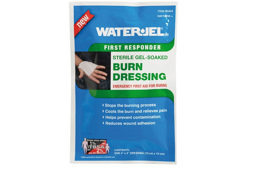 Schmerzlindernde, nichtklebende Kompresse in Folienverpackung, welche die Brandwunde sofort kühlt, ohne die Körpertemperatur zu senken, das Infektionsrisiko wird deutlich minimiert, sofort einsetzbar, Trägermaterial 100% med. Polyester, klinisch entwickeltes Gel, einzeln steril verpackt.